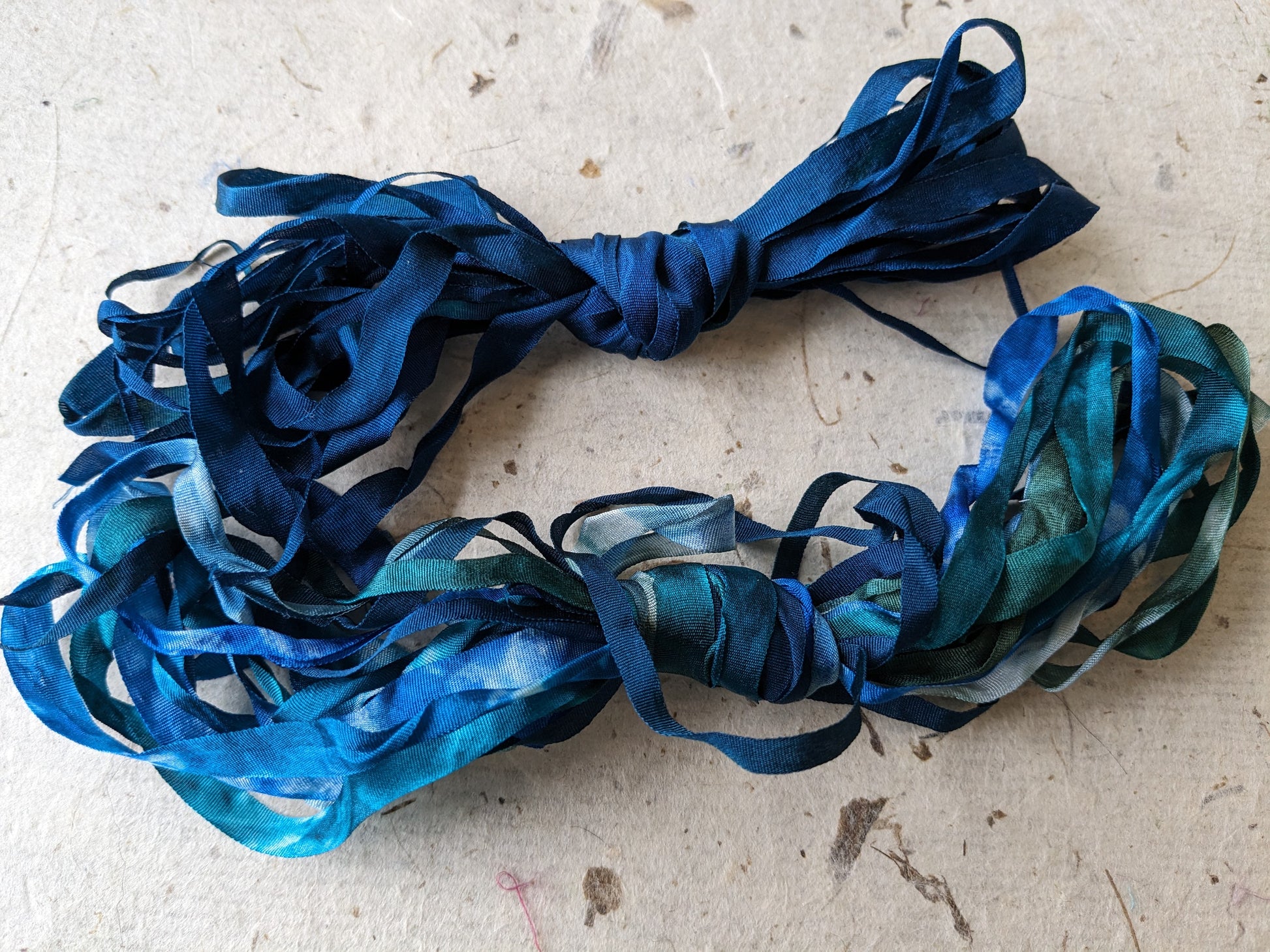 Ideal for all sorts of different creative textiles projects, embroidery, silk paper making and card making / scrap booking as alternative to ribbons or bakers twine? A lovely set of 6 hand dyed silk ribbons assorted widths. You will receive the ribbons in photo.