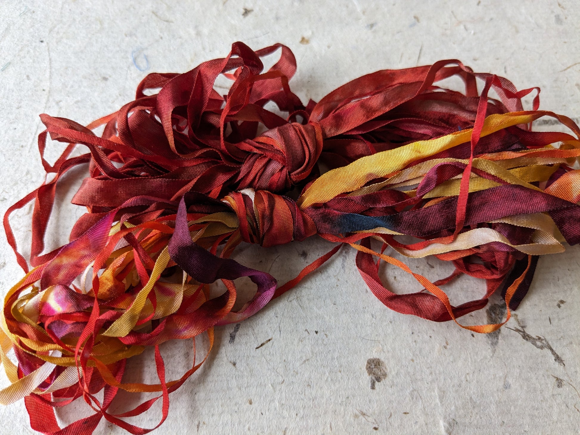 Ideal for all sorts of different creative textiles projects, embroidery, silk paper making and card making / scrap booking as alternative to ribbons or bakers twine? A lovely set of 6 hand dyed silk ribbons assorted widths. You will receive the ribbons in photo.