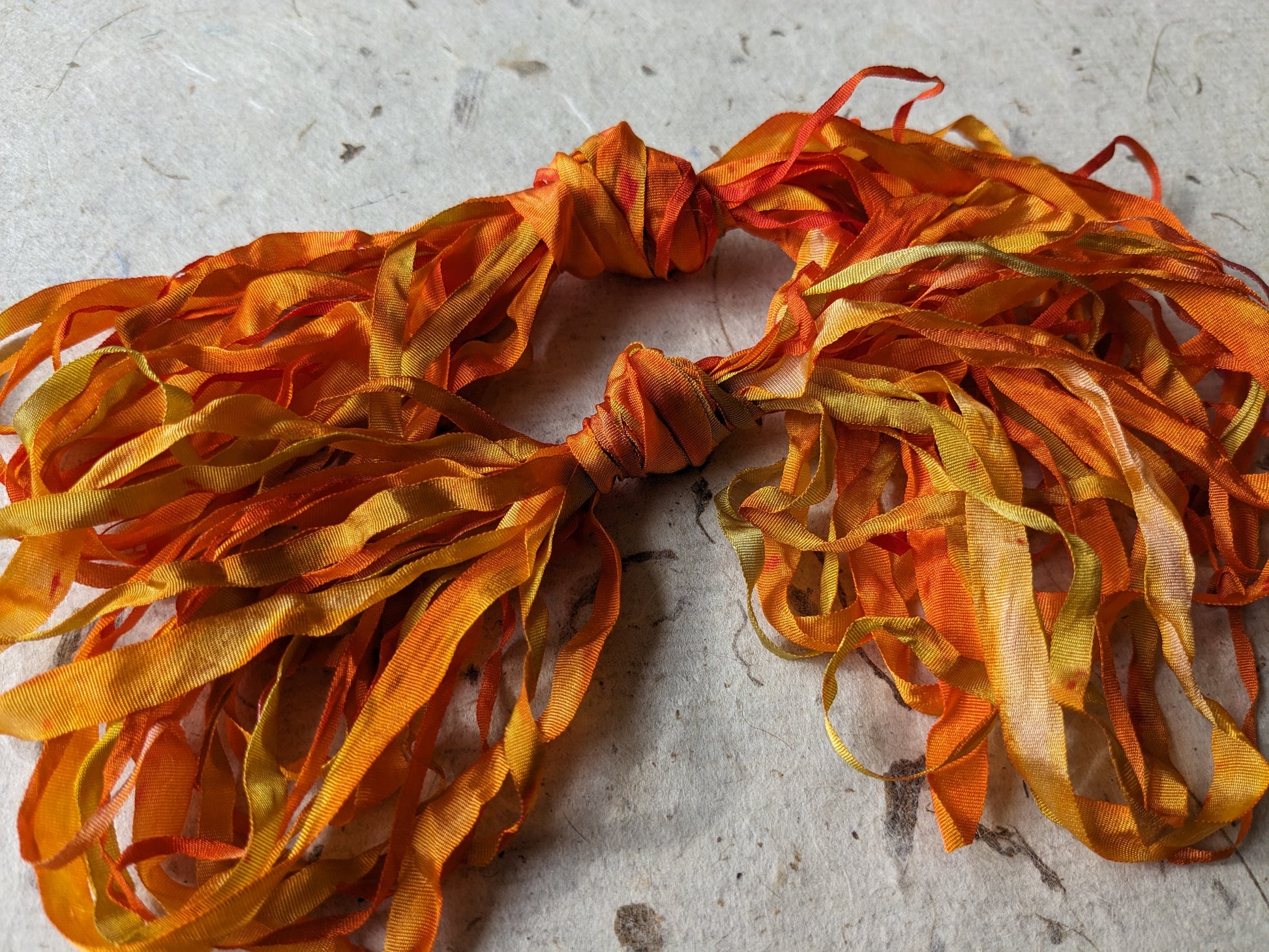 Ideal for all sorts of different creative textiles projects, embroidery, silk paper making and card making / scrap booking as alternative to ribbons or bakers twine? A lovely set of 6 hand dyed silk ribbons assorted widths. You will receive the ribbons in photo.