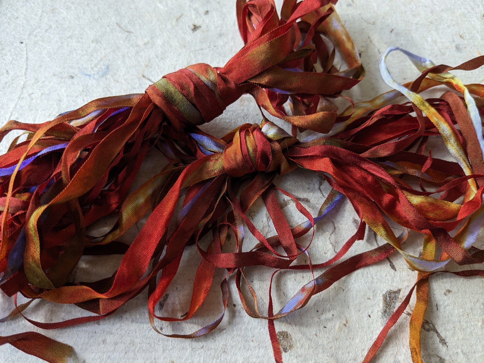 Ideal for all sorts of different creative textiles projects, embroidery, silk paper making and card making / scrap booking as alternative to ribbons or bakers twine? A lovely set of 6 hand dyed silk ribbons assorted widths. You will receive the ribbons in photo.