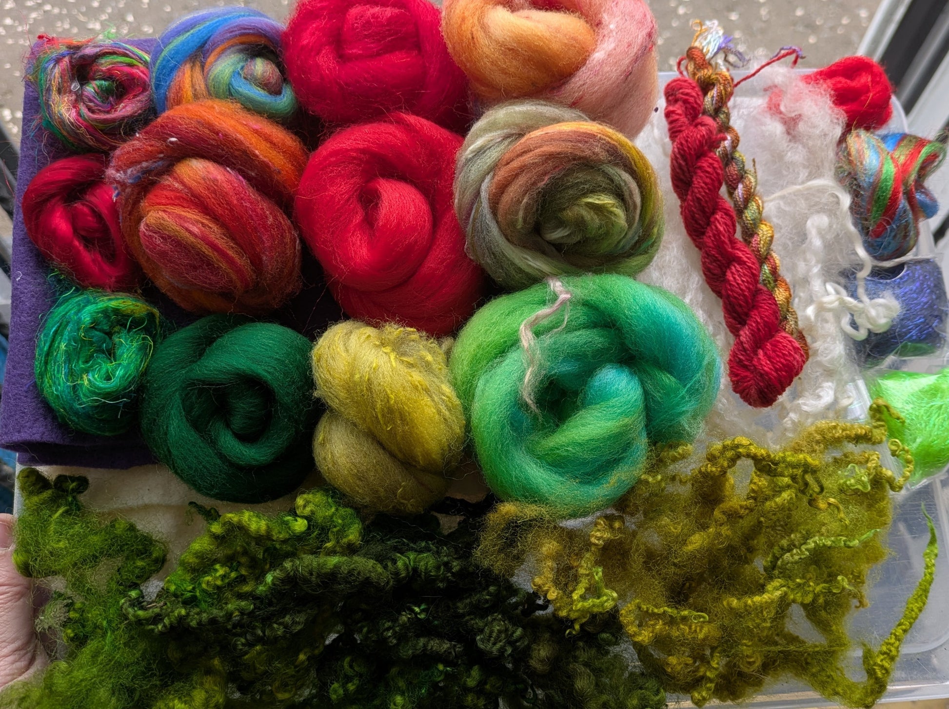 A selection of 2 large A3 pre felt wool fabrics, hand dyed yarn, hand dyed silk threads, recycled sari silk fibre, viscose, sparkle and Angelina, hand dyed wool top and fleece wool, custom blends and natural curls.