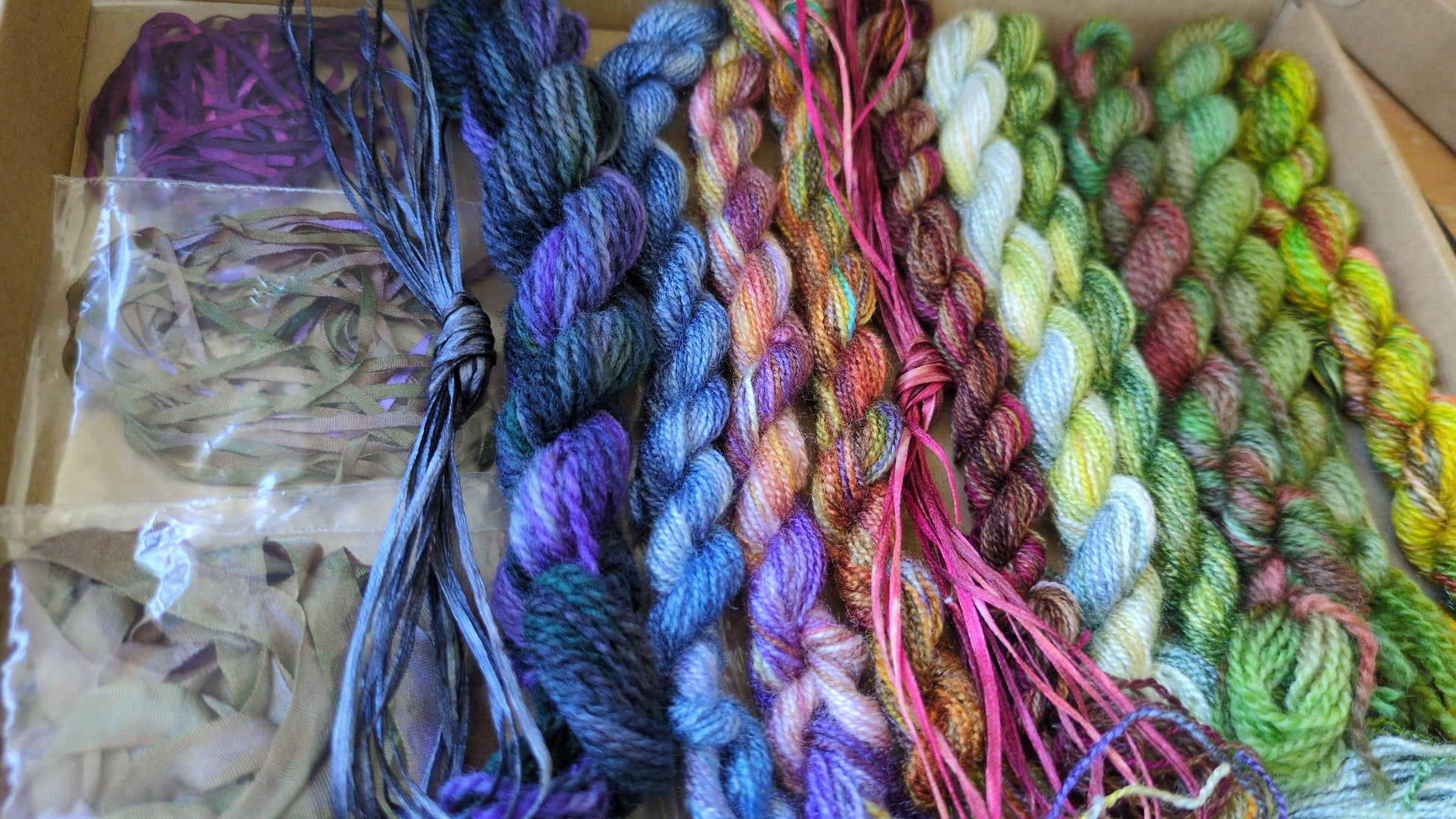 Assorted skeins of hand dyed silk threads, silk ribbons and raffia- a great mix of colours - Box09