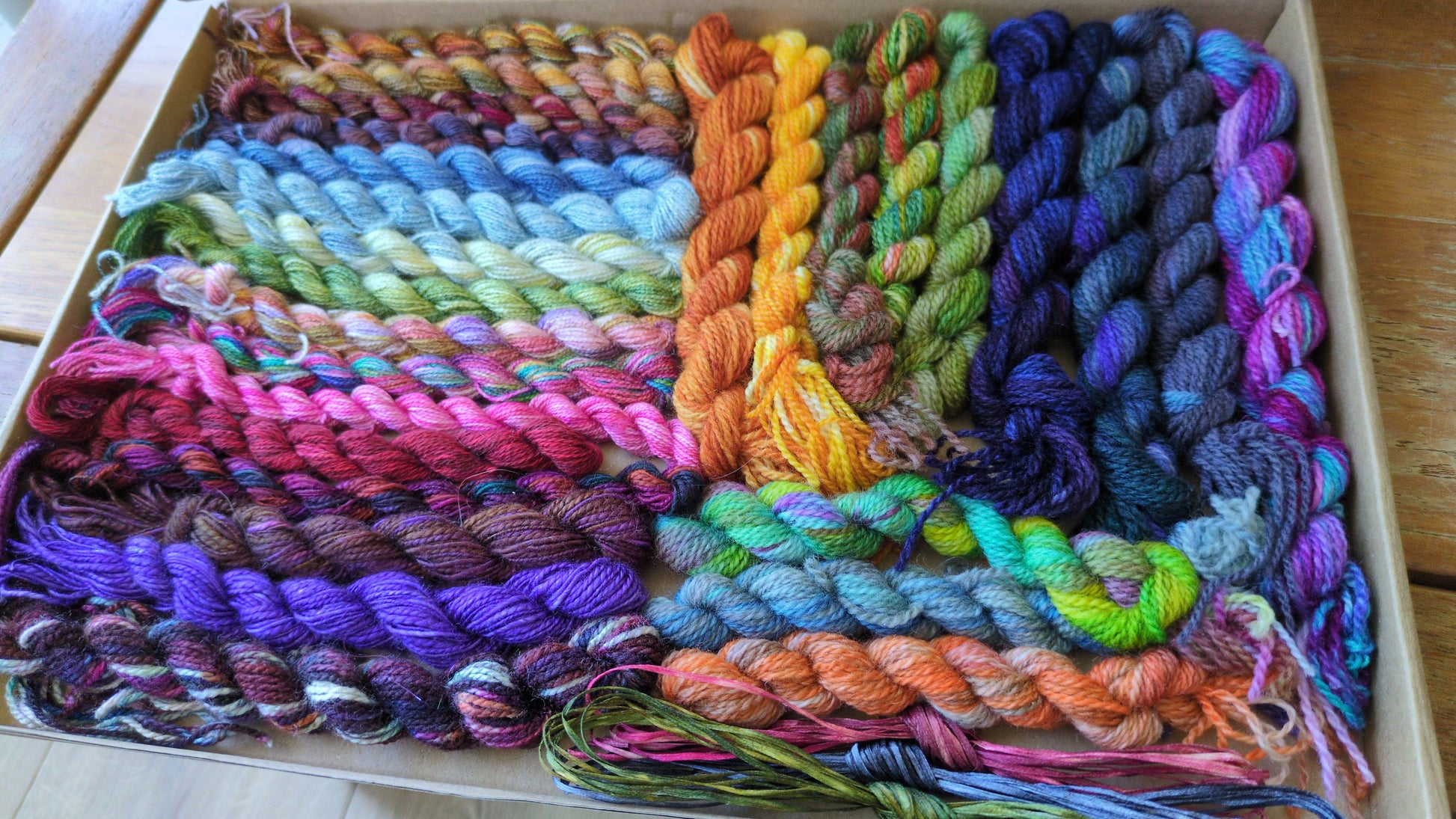 Assorted skeins of hand dyed silk threads,wool yarns, silk ribbons and raffia- a great mix of colours - Box03