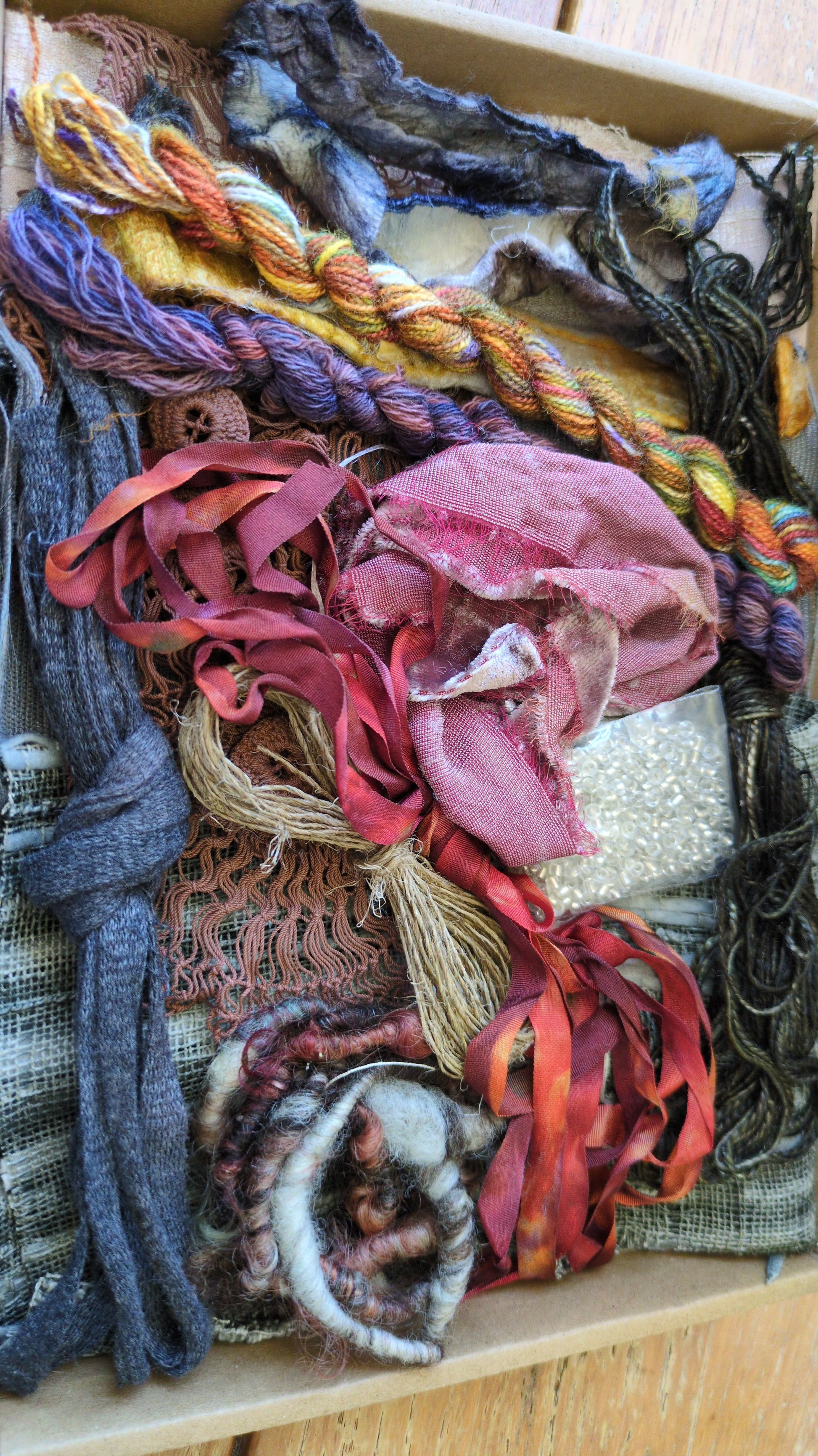 This range of creativity packs are ideal for an experimental mixed media textiles thistle stitch project. Commercial textural fabric pieces, hand dyed silk rods, Hand dyed silk ribbons and thread with additions.