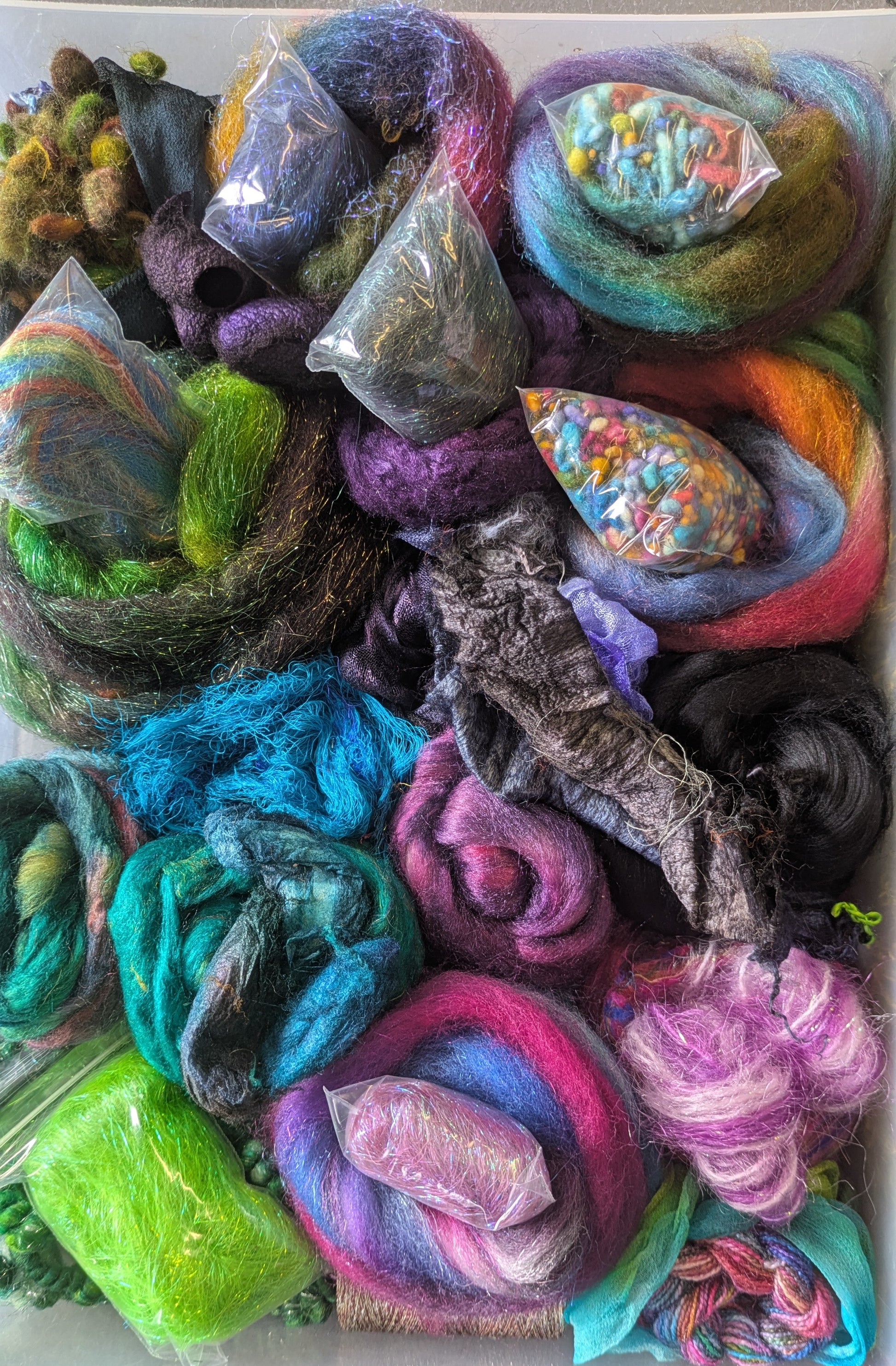Wonderful for wet felting but has many other uses. Hand dyed wool blends, hand dyed Merino/silk pre felt, Black viscose, hand dyed silk fibres and fabrics , synthetic sparkly fibre -Angelina/trilobal, silk rods, cocoons and pebbles with hand dyed silk thread/wool and silk selvedge.