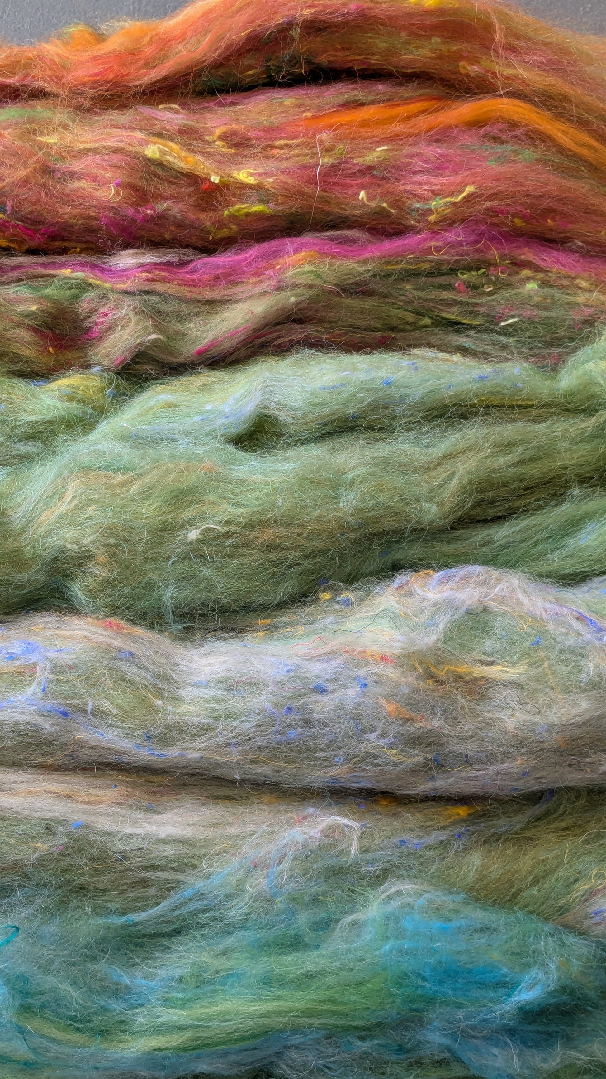 Carded luxury Batt layers for producing fabulous effects in your needle felt or wet felt creations. Hand dyed and commercially dyed wool blended with added textures such as silk or plant fibres. Great for creating instant texture in your needle felted or wet felted landscape pieces