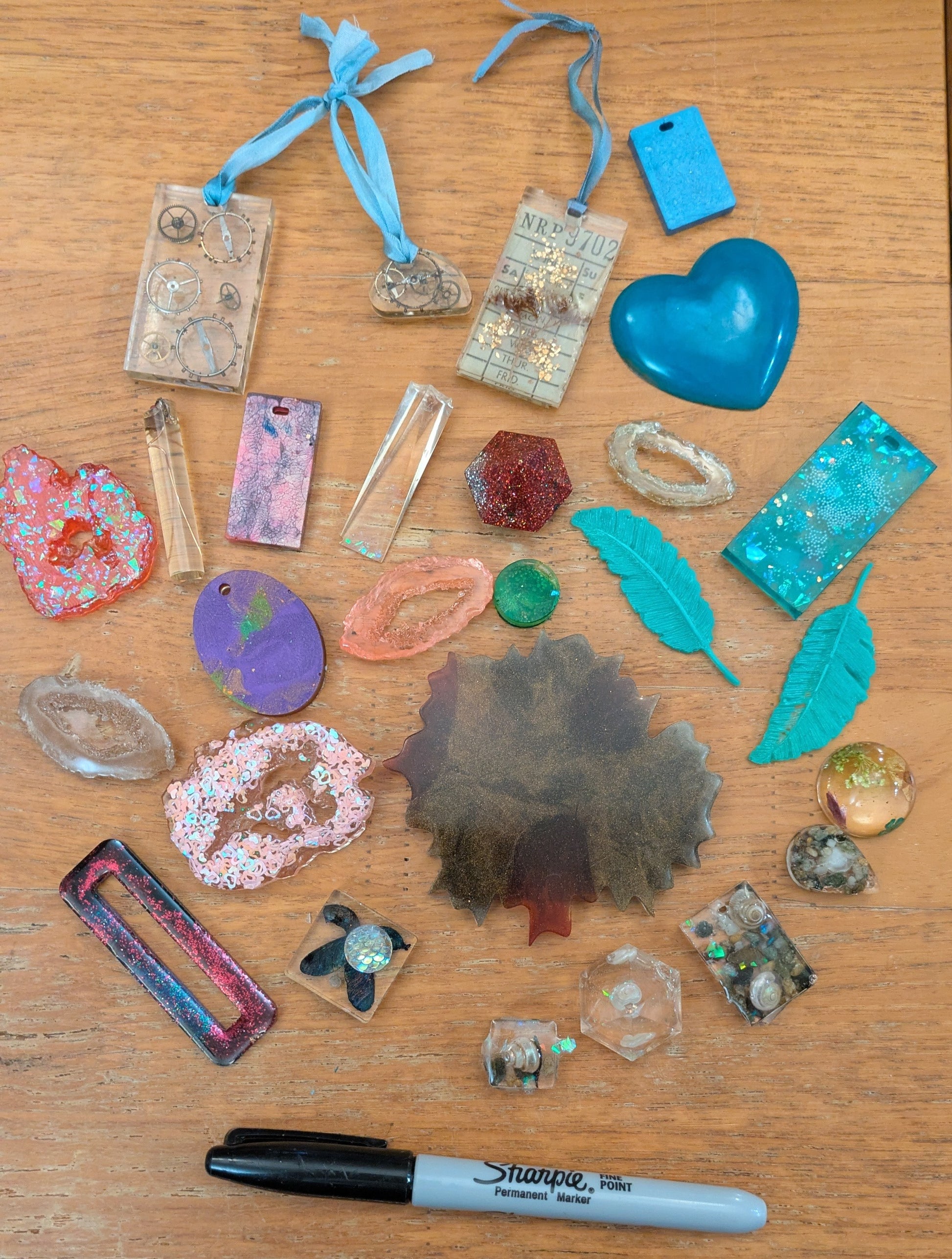 Hope is mo longer teaching resin so having a sample clear out. Lots of bits great for mixed media projects. I have photographed with a pen for scale