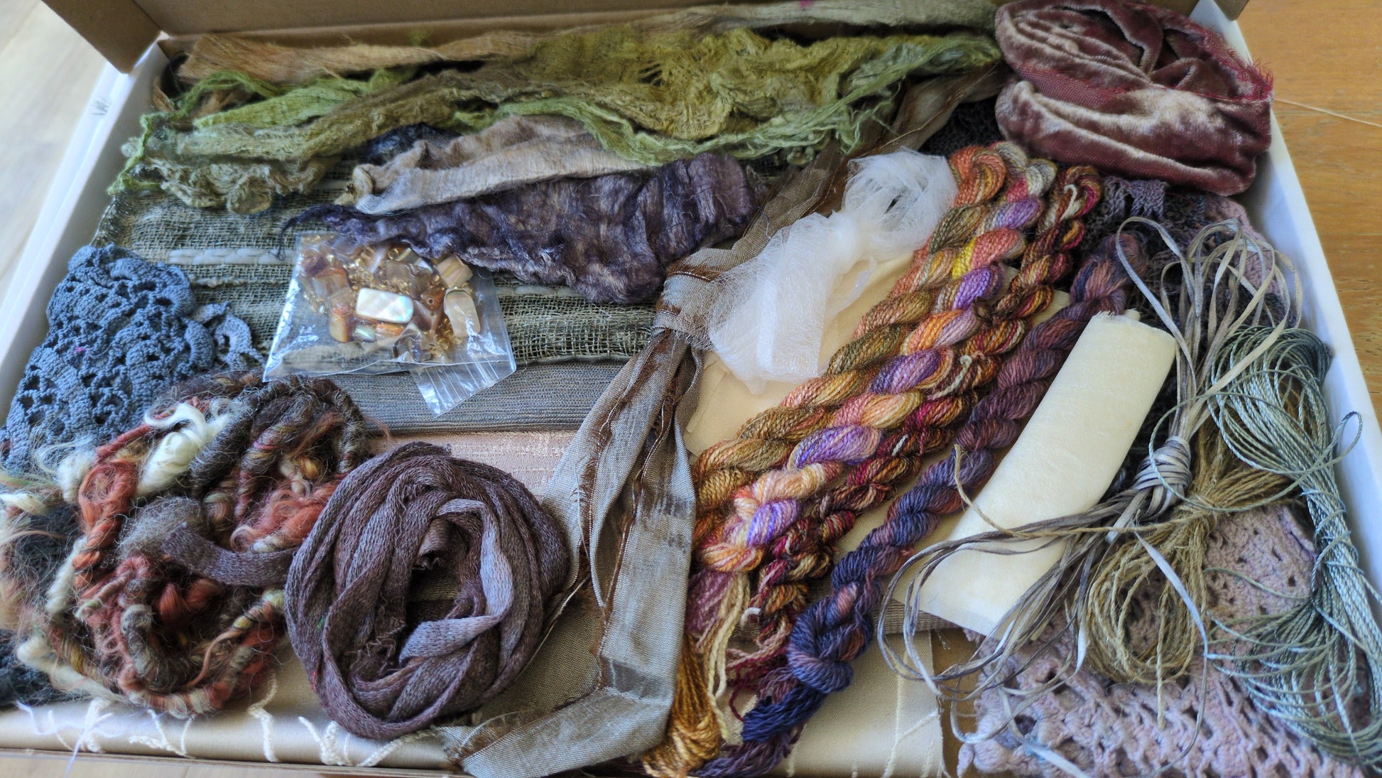 This range of creativity packs are ideal for an experimental mixed media textiles thistle stitch project. Commercial textural fabric pieces, hand dyed silk rods, hand dyed mulberry bark, hand dyed lace, Hand dyed silk ribbons and thread with additions.