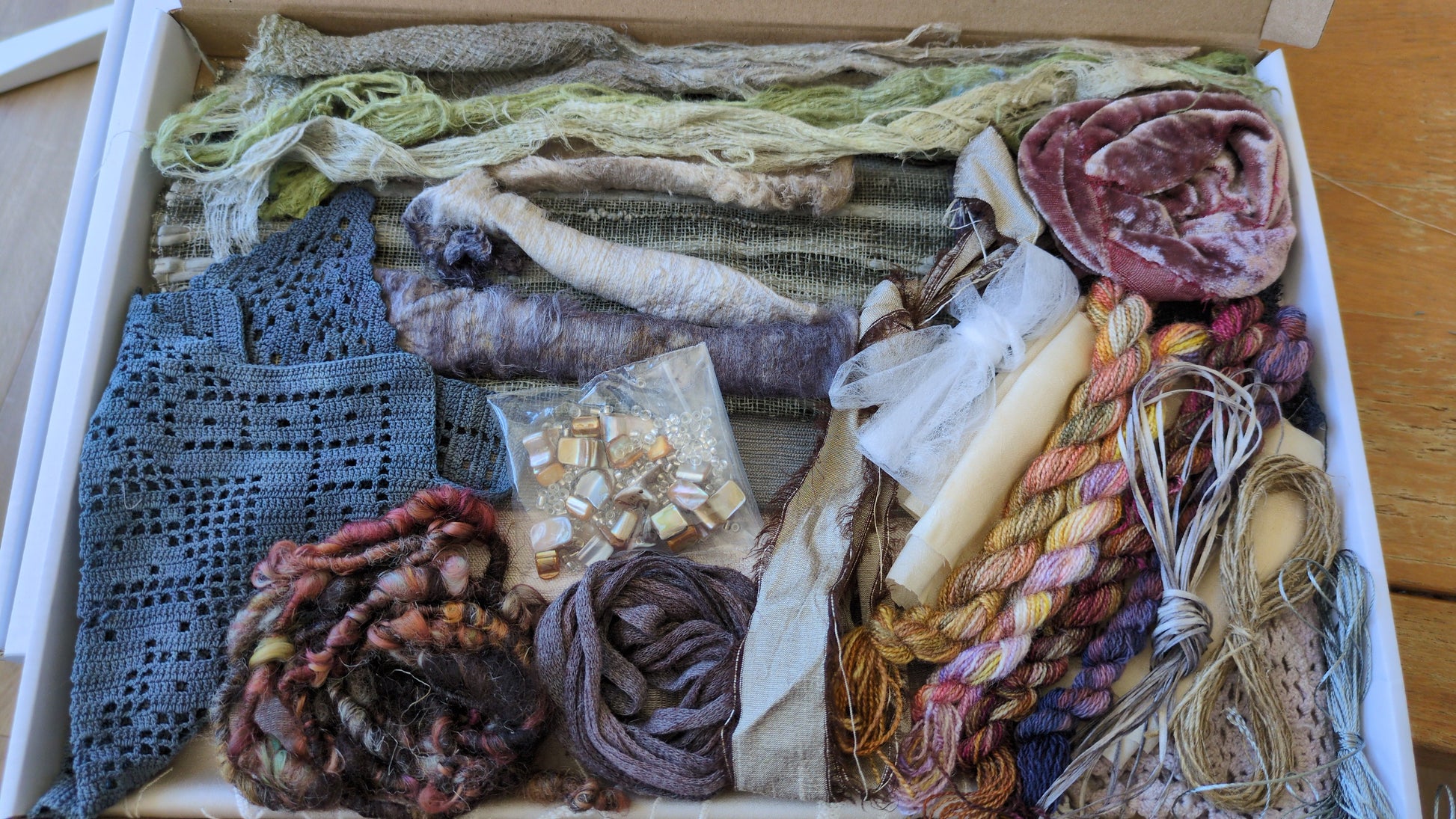 This range of creativity packs are ideal for an experimental mixed media textiles thistle stitch project. Commercial textural fabric pieces, hand dyed silk rods, hand dyed mulberry bark, hand dyed lace, Hand dyed silk ribbons and thread with additions.