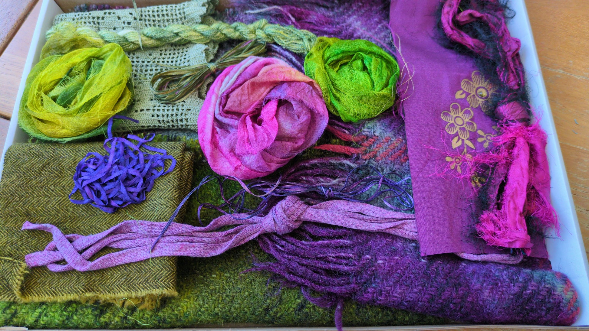 This range of creativity packs are ideal for an experimental mixed media textiles thistle stitch project. Hand dyed wool/ vintage blanket pieces, hand dyed lightweight silk fabric pieces, hand dyed lace, recycled silk sari ribbons, Hand dyed silk ribbons and thread and silk raffia with additions.