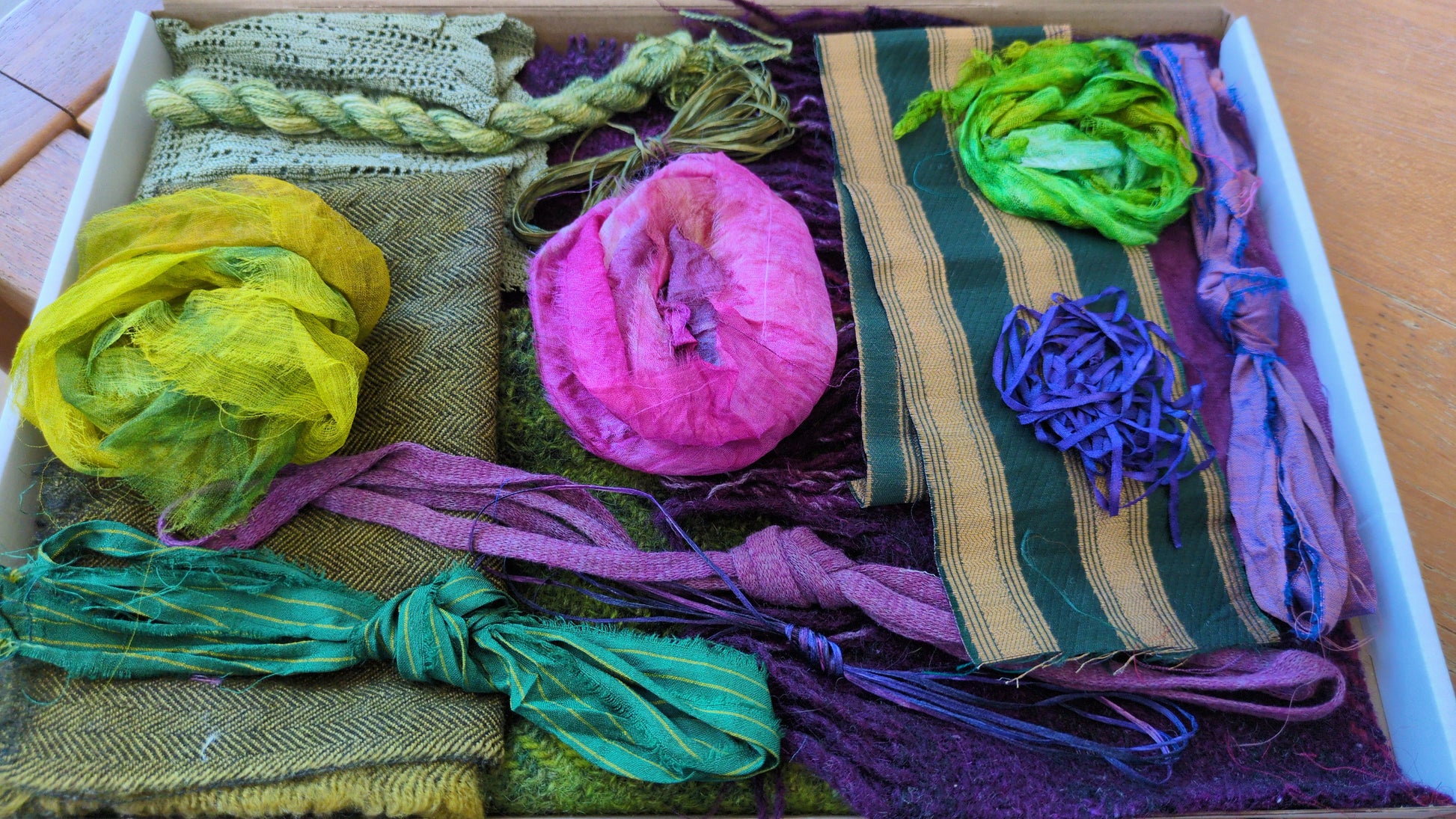 This range of creativity packs are ideal for an experimental mixed media textiles thistle stitch project. Hand dyed wool/ vintage blanket pieces, hand dyed lightweight silk fabric pieces, hand dyed lace, recycled silk sari ribbons, Hand dyed silk ribbons and thread and silk raffia with additions.