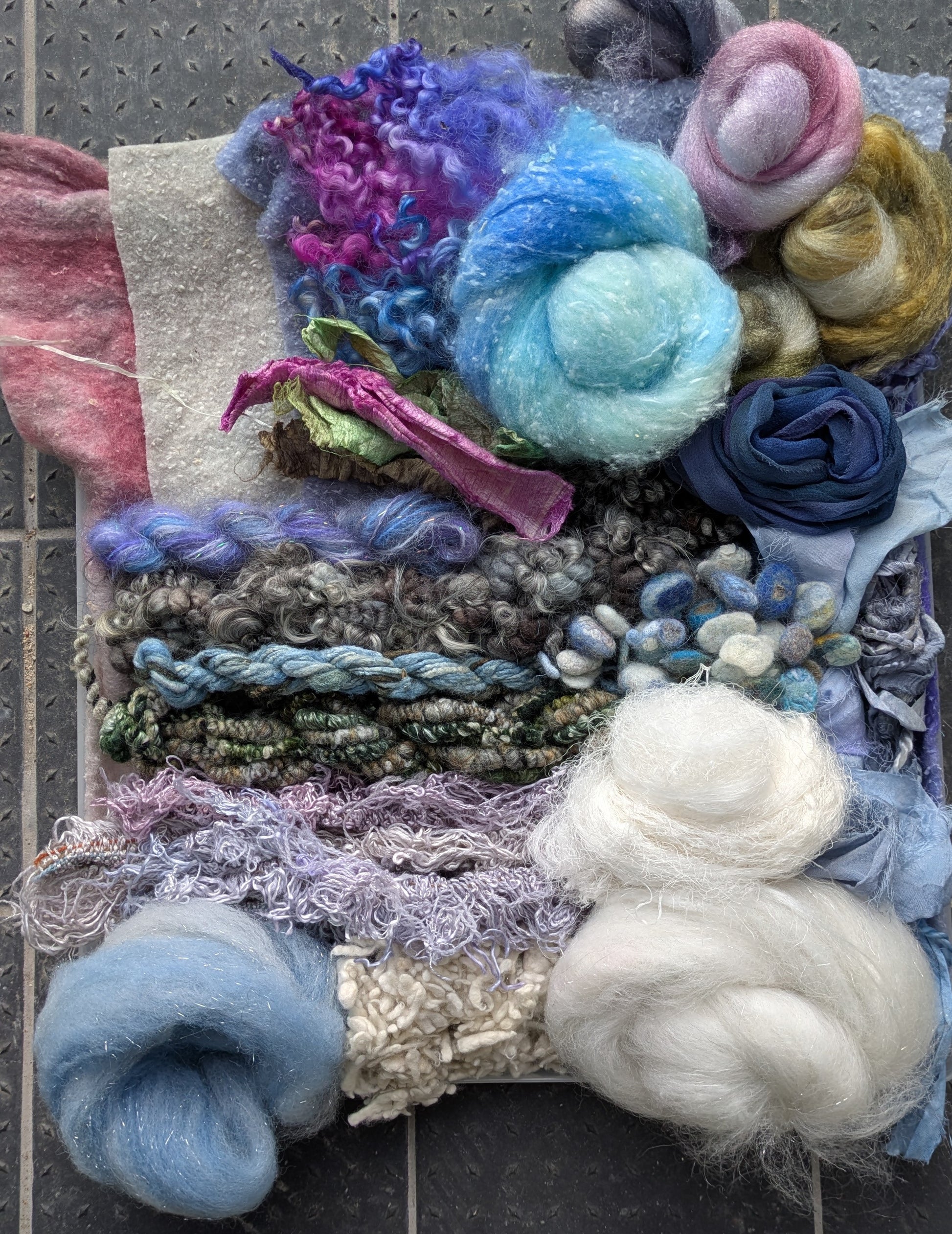 Hand dyed luxury felting selection. Contains 3 x A4 hand dyed Merino/silk pre-felt, hand spun yarns, hand dyed silk and wool threads, hand dyed silk fabric, cashmere nepps, silk silk edge, natural and hand dyed silk, nylon and carded snow blend. Great for creating instant texture in your wet felted pieces. This selection I created with Winter in mind.