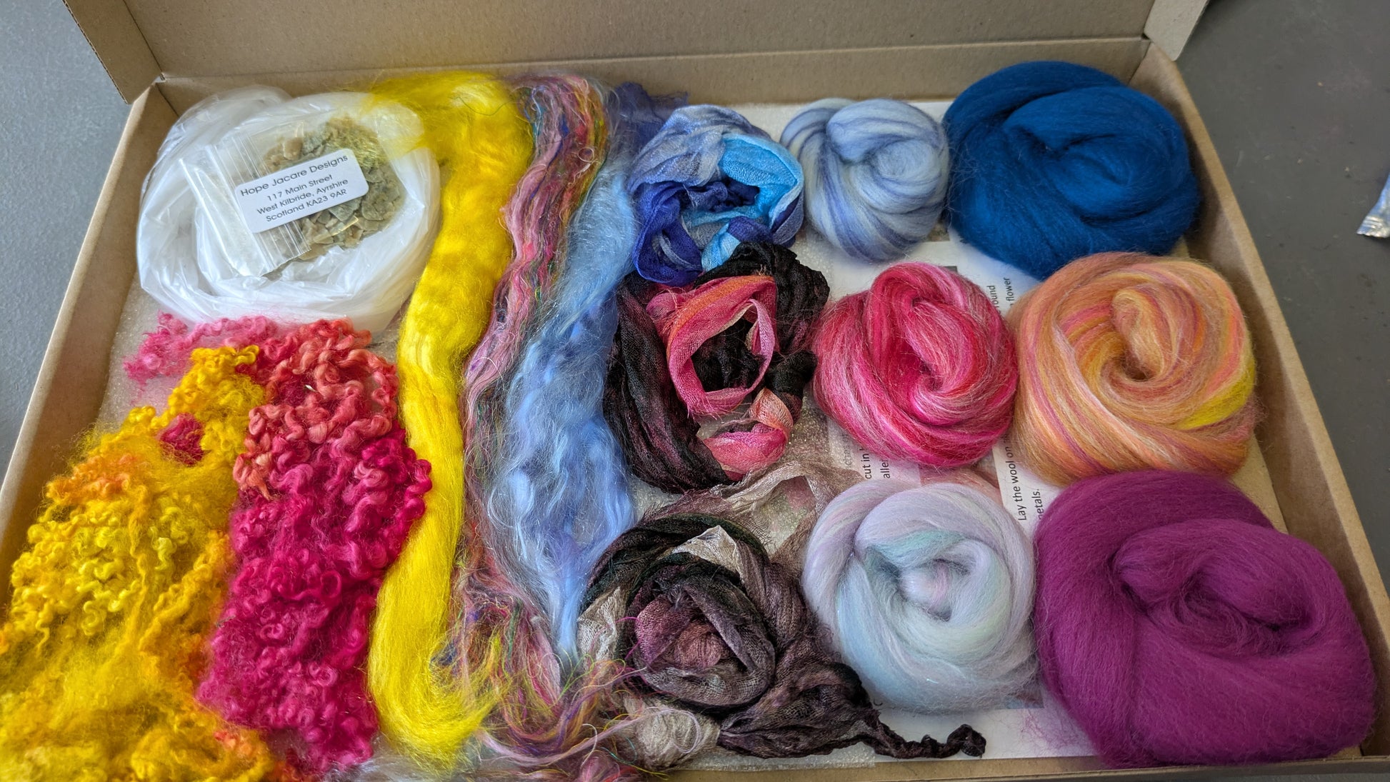 This is the new luxury "Nuno Flower" wet felting kit. It is a lovely selection of special hand dyed and commercially dyed elements . It contains hand dyed silk gauze, wool top blends, hand dyed locks, silk and plant fibres, resist, plastic drop cloth and olive oil soap.