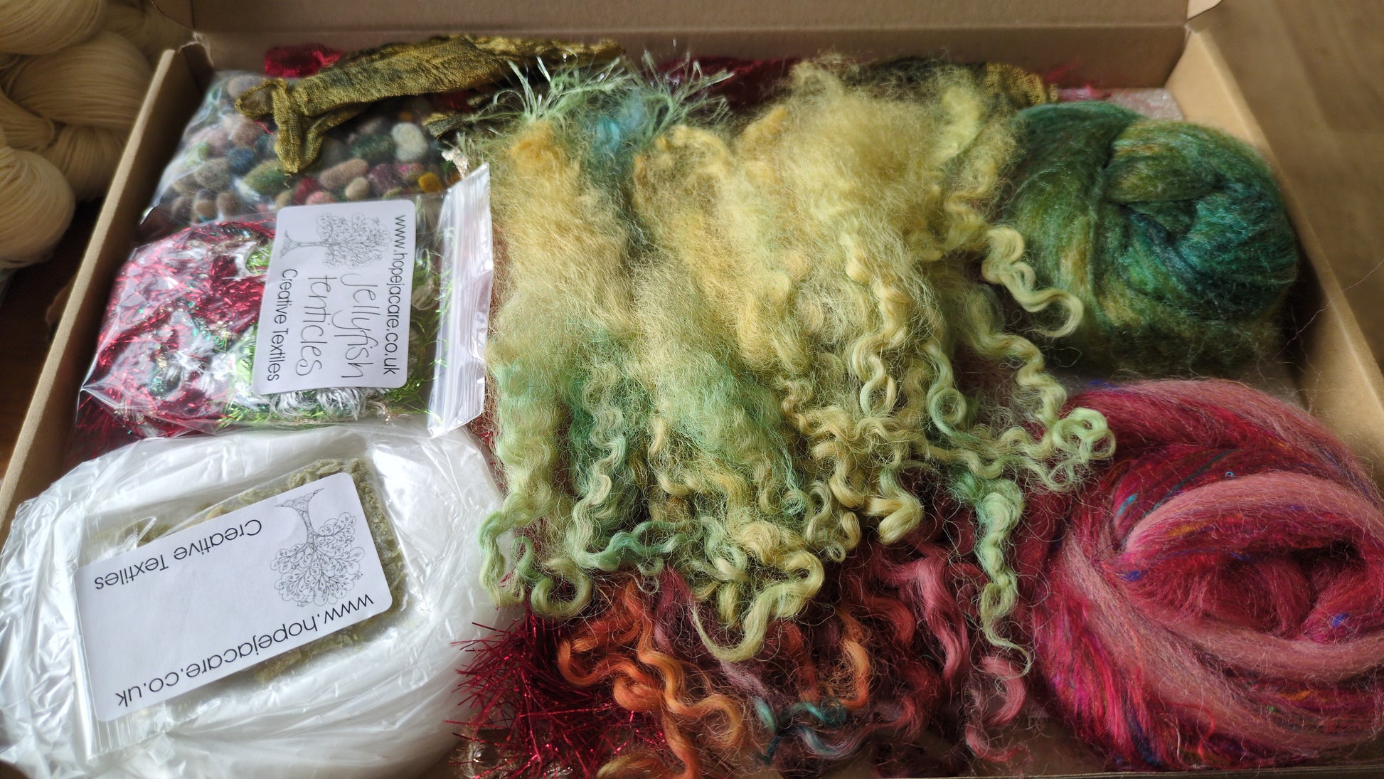 This is the new luxury "Nuno Jellyfish" wet felting kit. It is a lovely selection of special hand dyed and hand made elements . It contains hand dyed silk gauze, wool top blends, hand dyed locks, hand made wool pebbles, fancy yarns, resist, plastic drop cloth and olive oil soap.