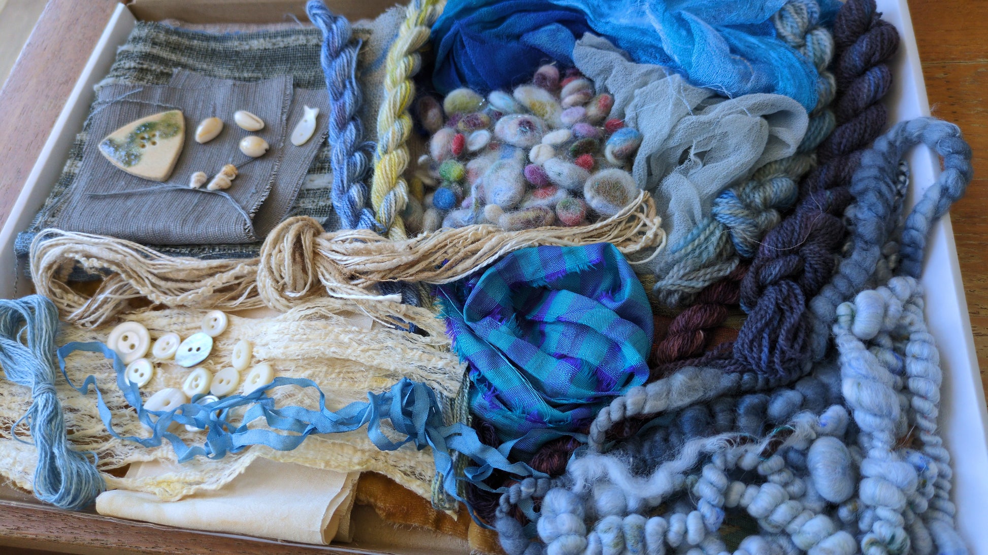 This range of creativity packs are ideal for a luxury experimental mixed media textiles seascape stitch project. Hand dyed silk velvet, commercial fabric pieces, hand dyed lightweight silk fabric pieces, Hand dyed threads and ribbon with additions. A very special handmade seascape button created by Hope