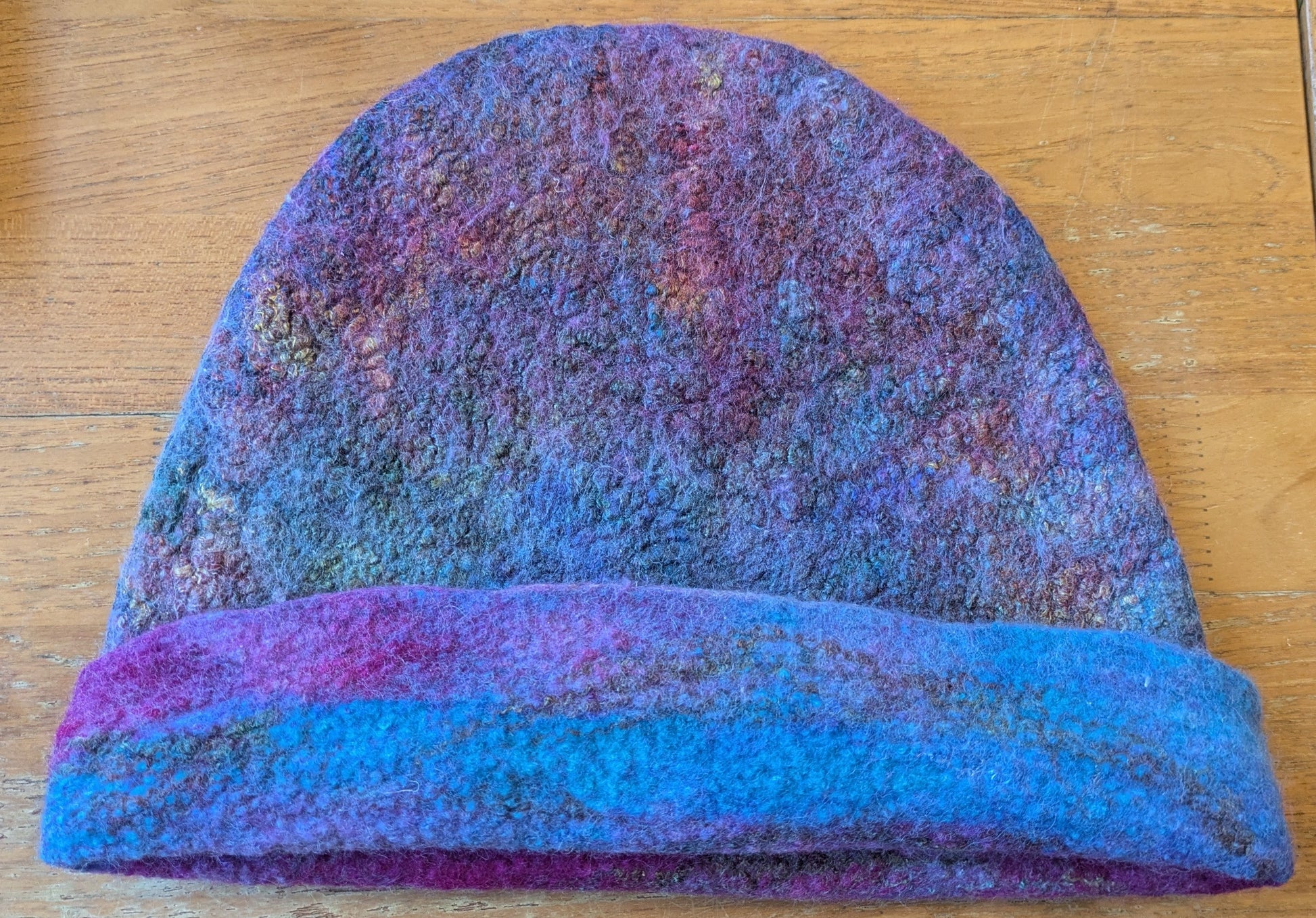 It is suitable for felt makers at any level. We will spend the morning laying out your creation using the huge selection of commercial and hand dyed fibres and silk fabric from the studio. After lunch we will felt the hats by hand.