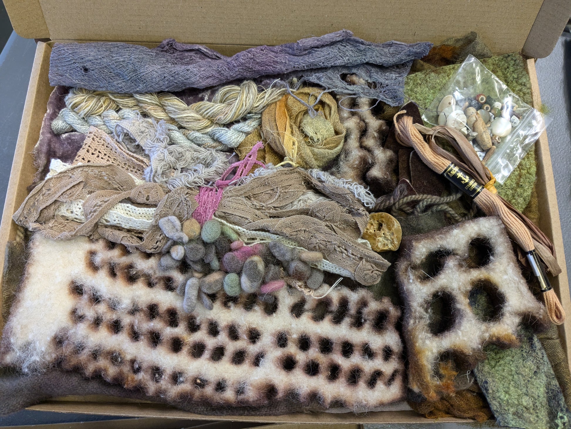 A selection of hand dyed fabrics including a piece of silk velvet , hand dyed industrial felt, small piece handmade felt, mulberry bark, wool pebbles, silk string/ribbons and hand dyed threads. Some special additions such as a hagstone, semi precious stone beads, vintage buttons and other interesting bits.