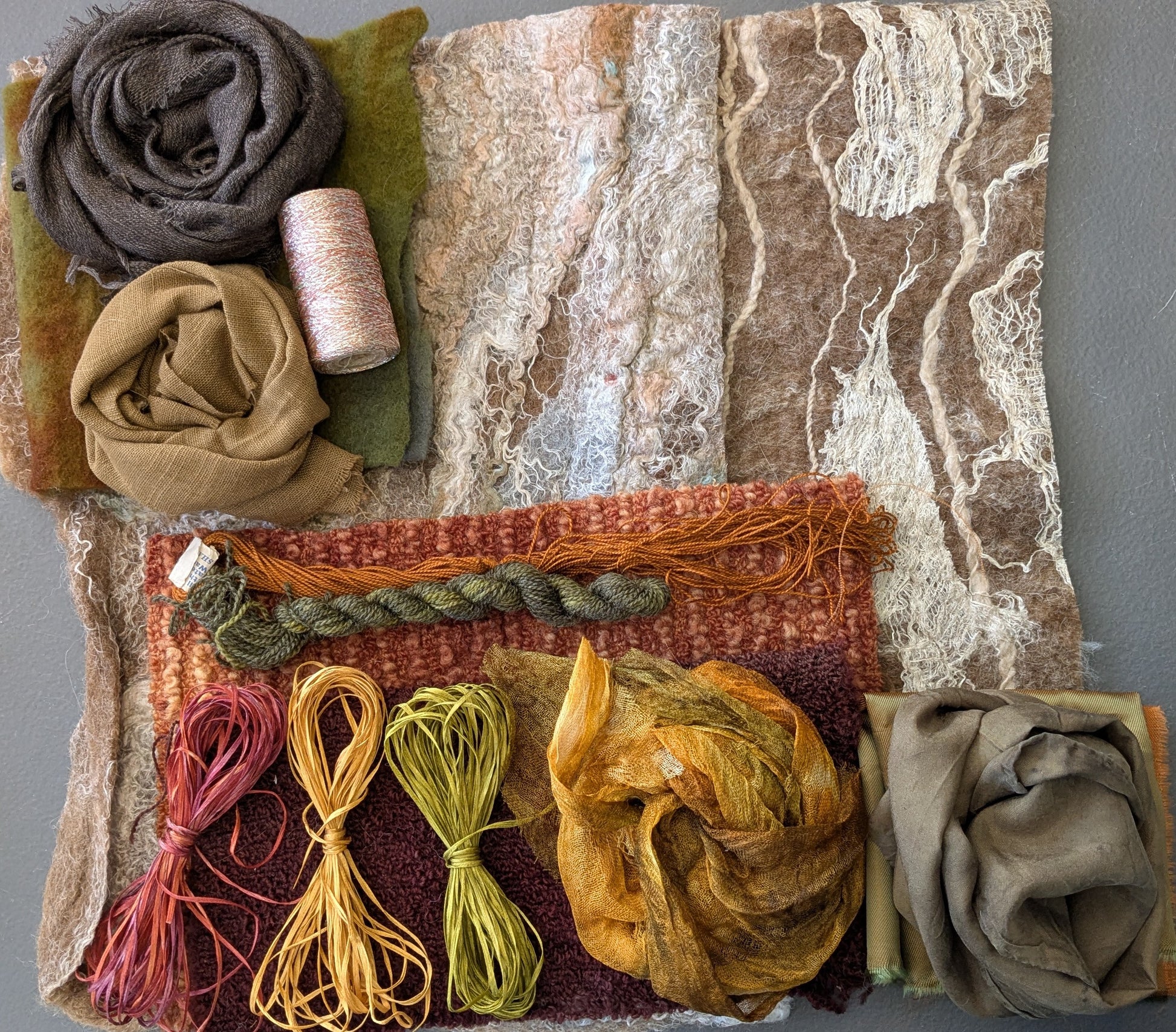 Handmade felt piece approx A4 using a base of merino and plant fibre surface for interesting texture, also a smaller piece combining mulberry bark. Hand dyed silk raffia style ribbons, hand dyed silk margilan gauze, other fabrics and threads.