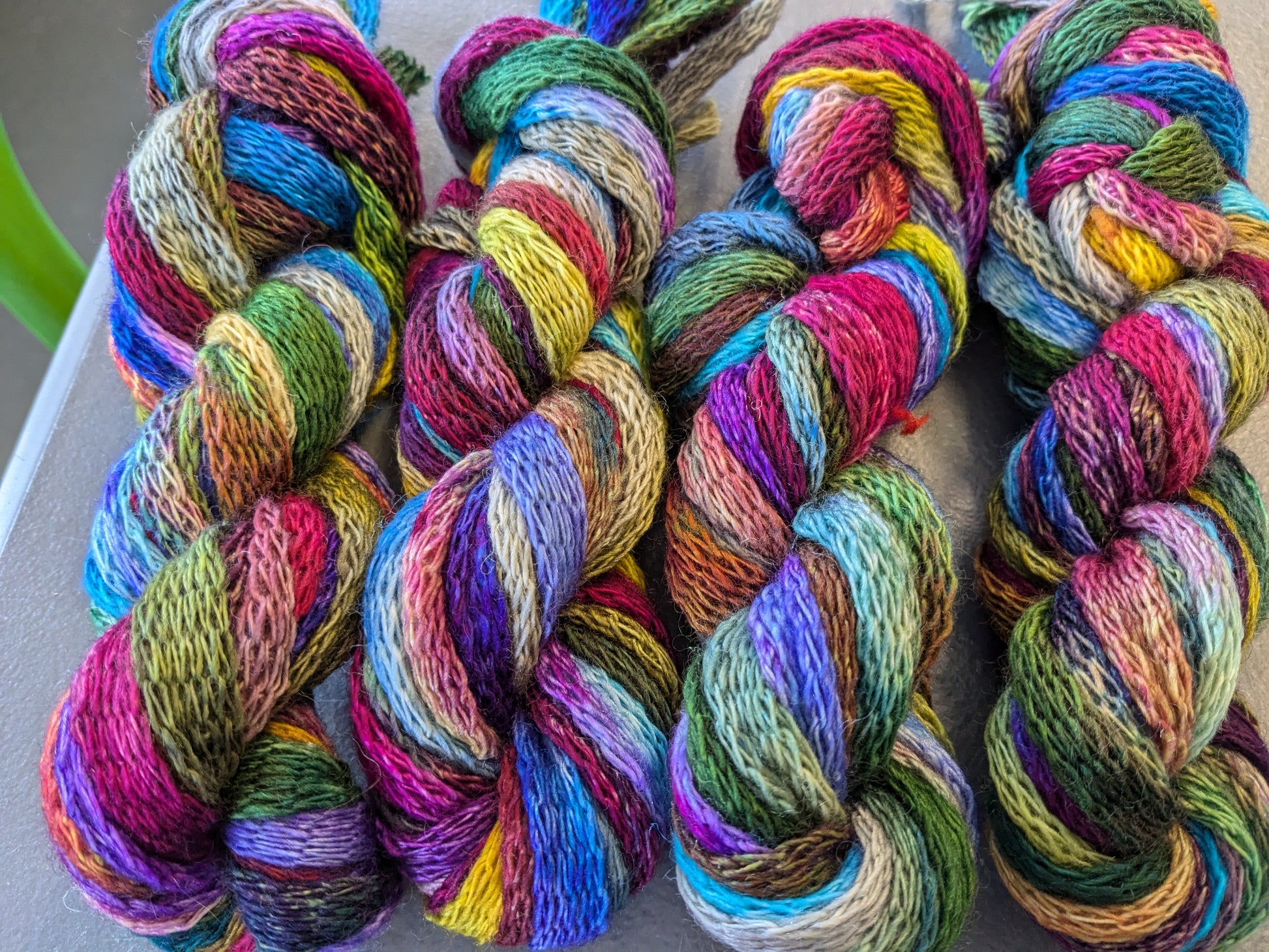 A hank of hand dyed merino tubular yarn, fabulous fun yarn could be used in all sorts of textiles projects - weaving, knitting, felting - slow stitch......experimental potential!