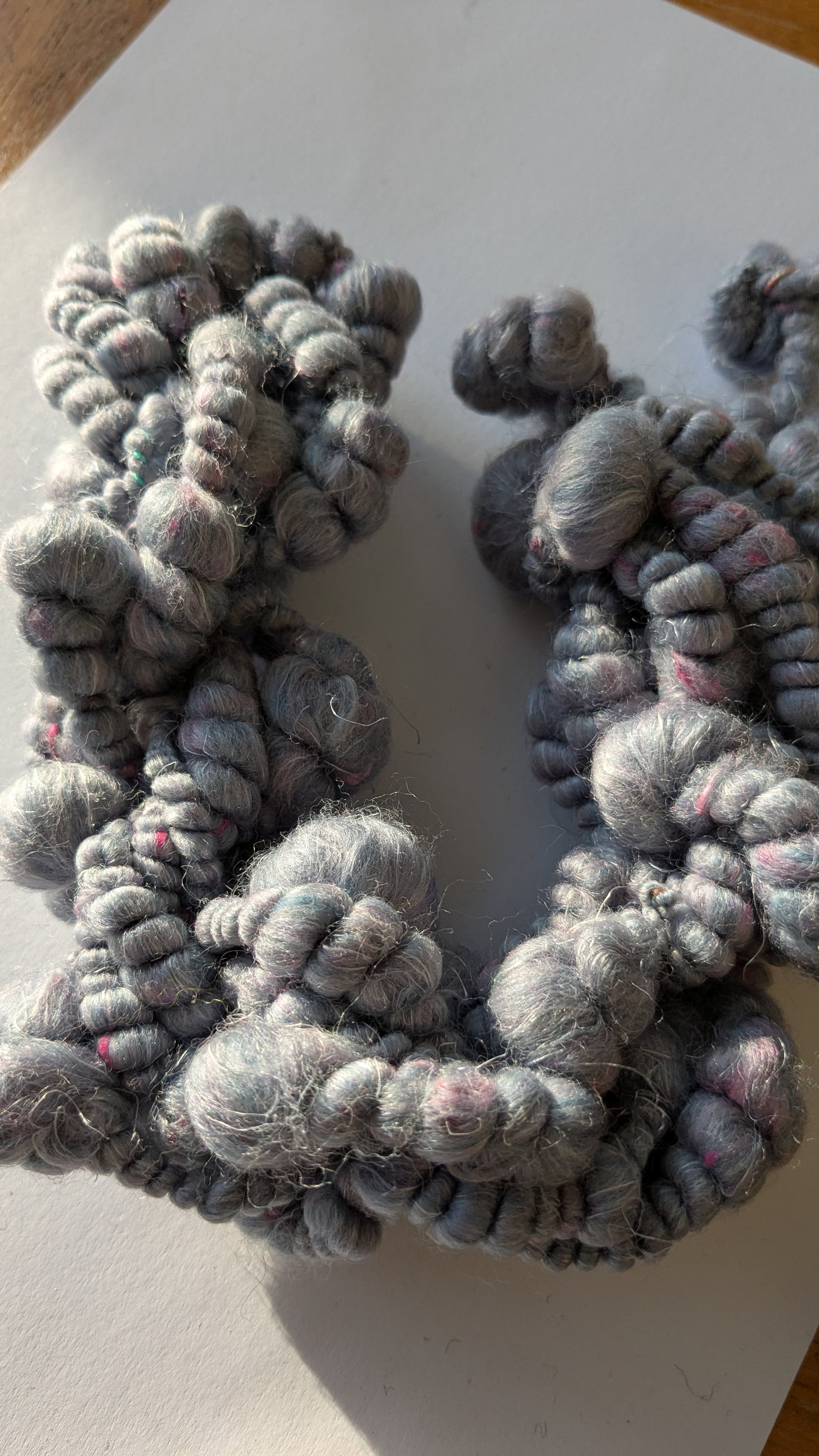 Hand spun skeins of arty yarn. Great fun for adding into experimental textiles projects for texture. The skein is 40g. These chunkier coil yarns are approx 3 m