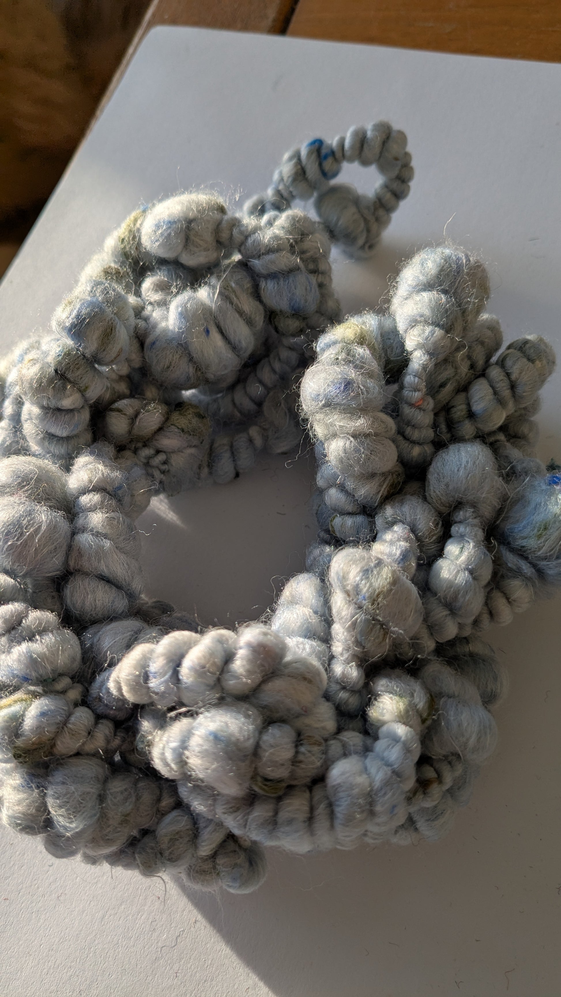 Hand spun skeins of arty yarn. Great fun for adding into experimental textiles projects for texture. The skein is 40g. These chunkier coil yarns are approx 3 m