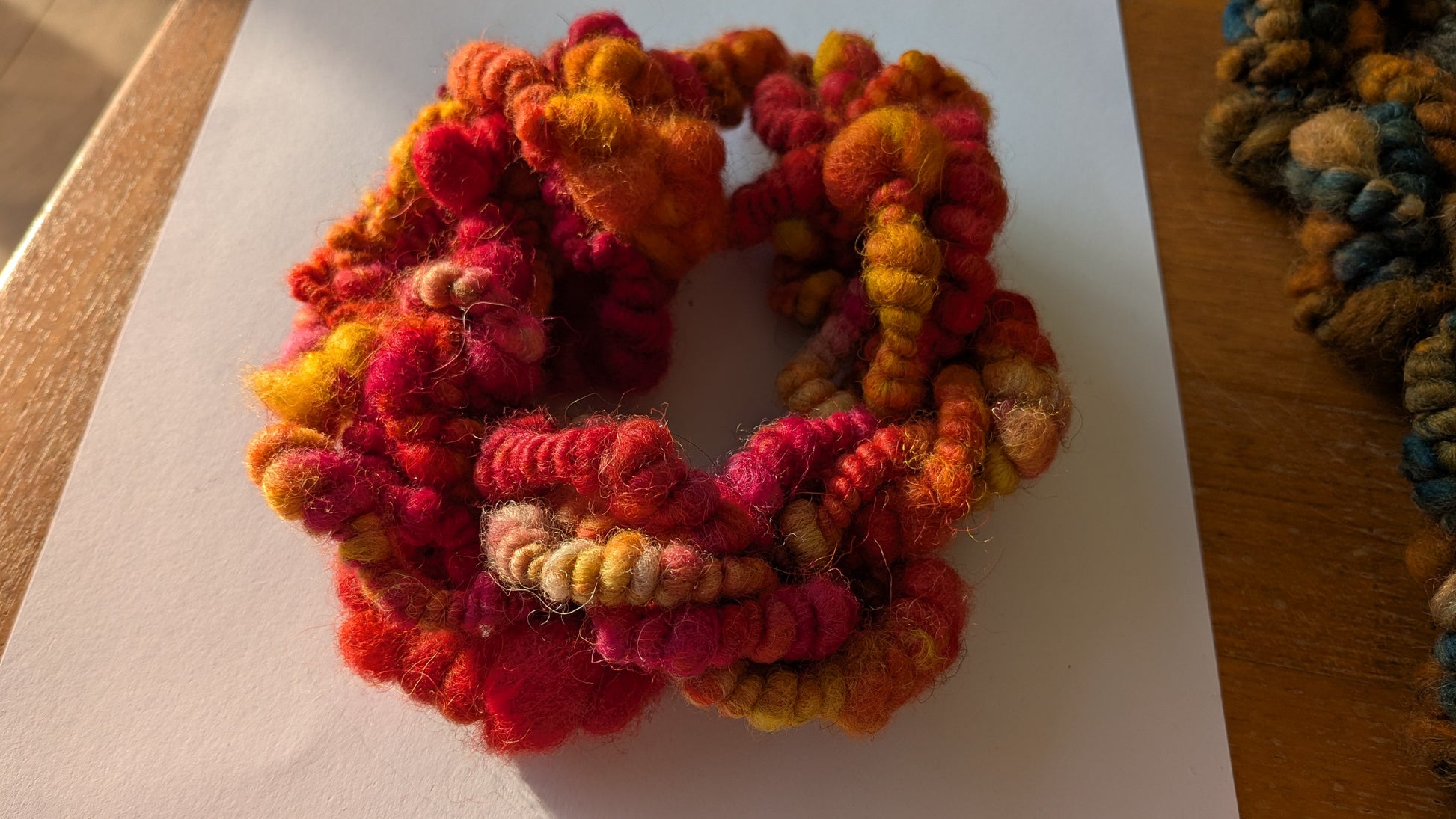 Hand spun skeins of arty yarn. Great fun for adding into experimental textiles projects for texture. The skein is 40g. These chunkier coil yarns are approx 3 m