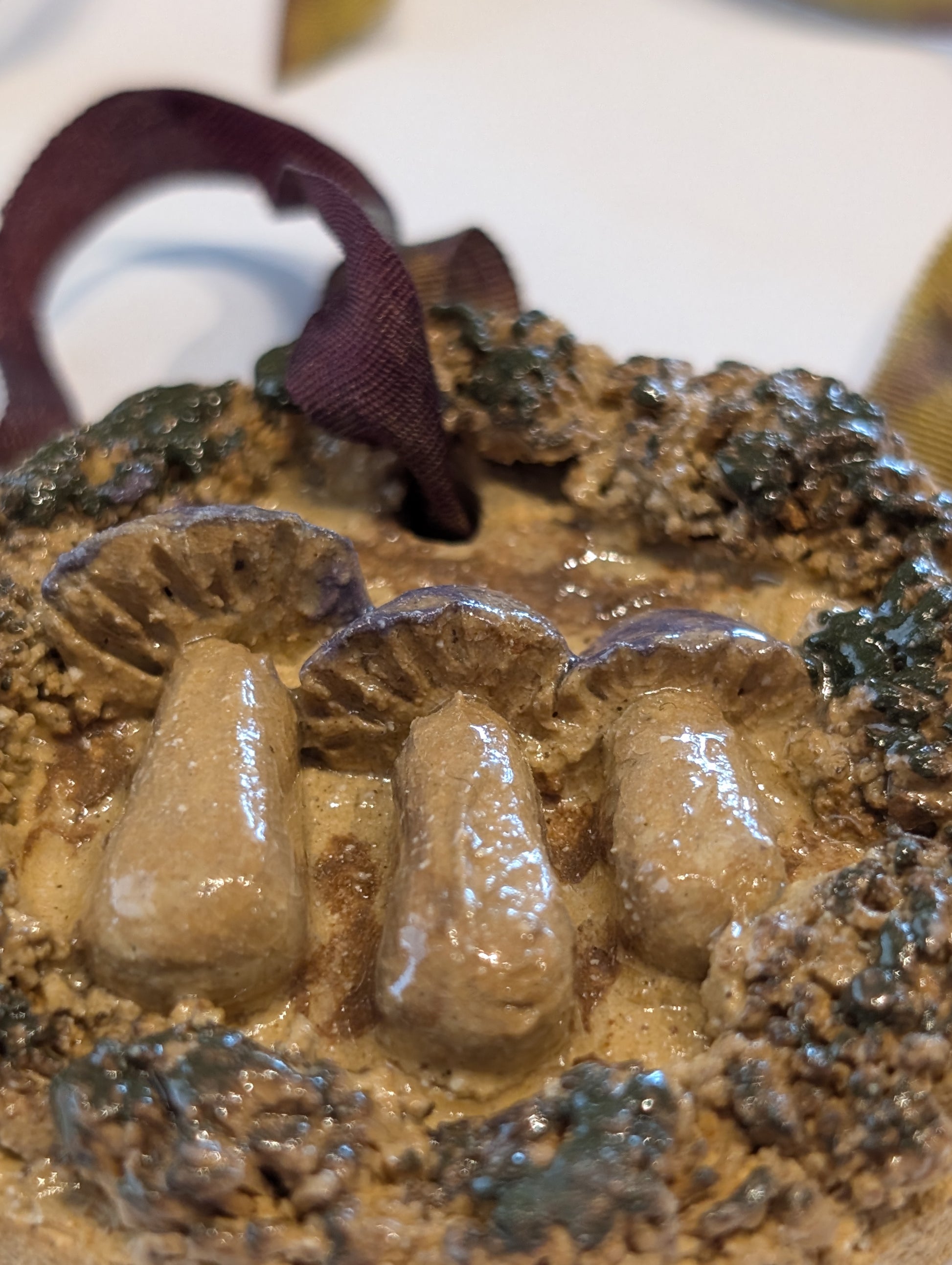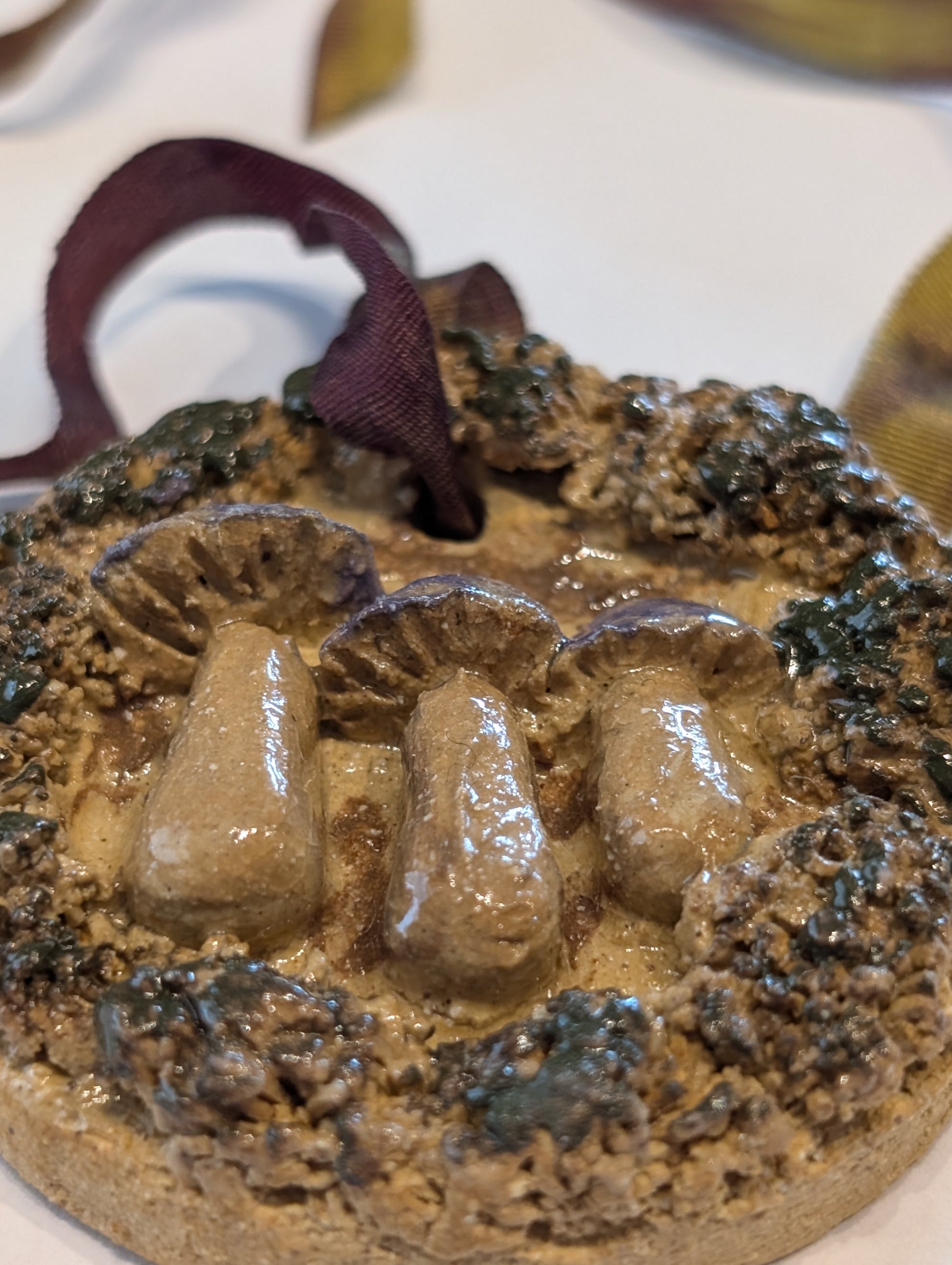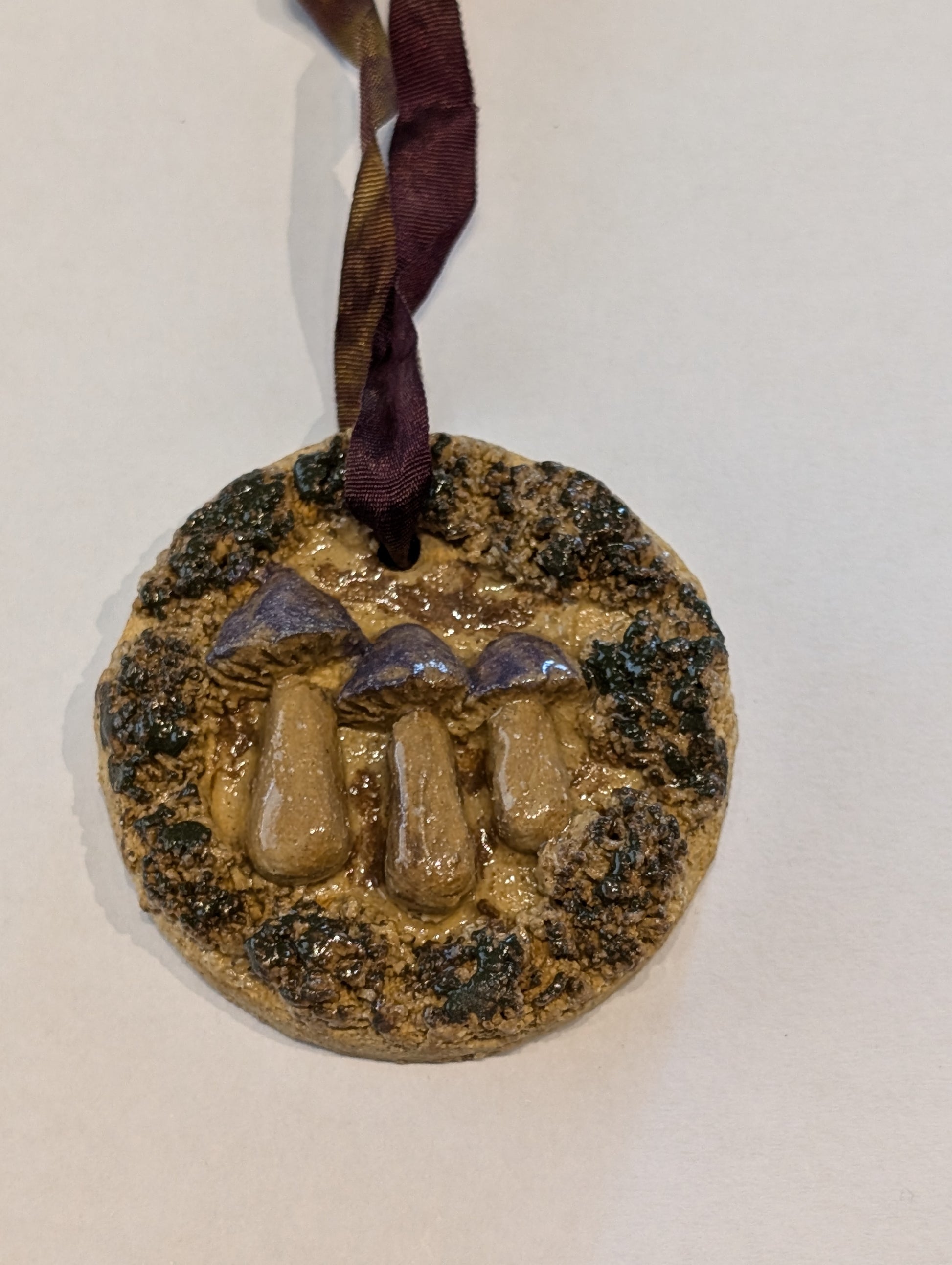 Hanging ceramic round mushroom piece.